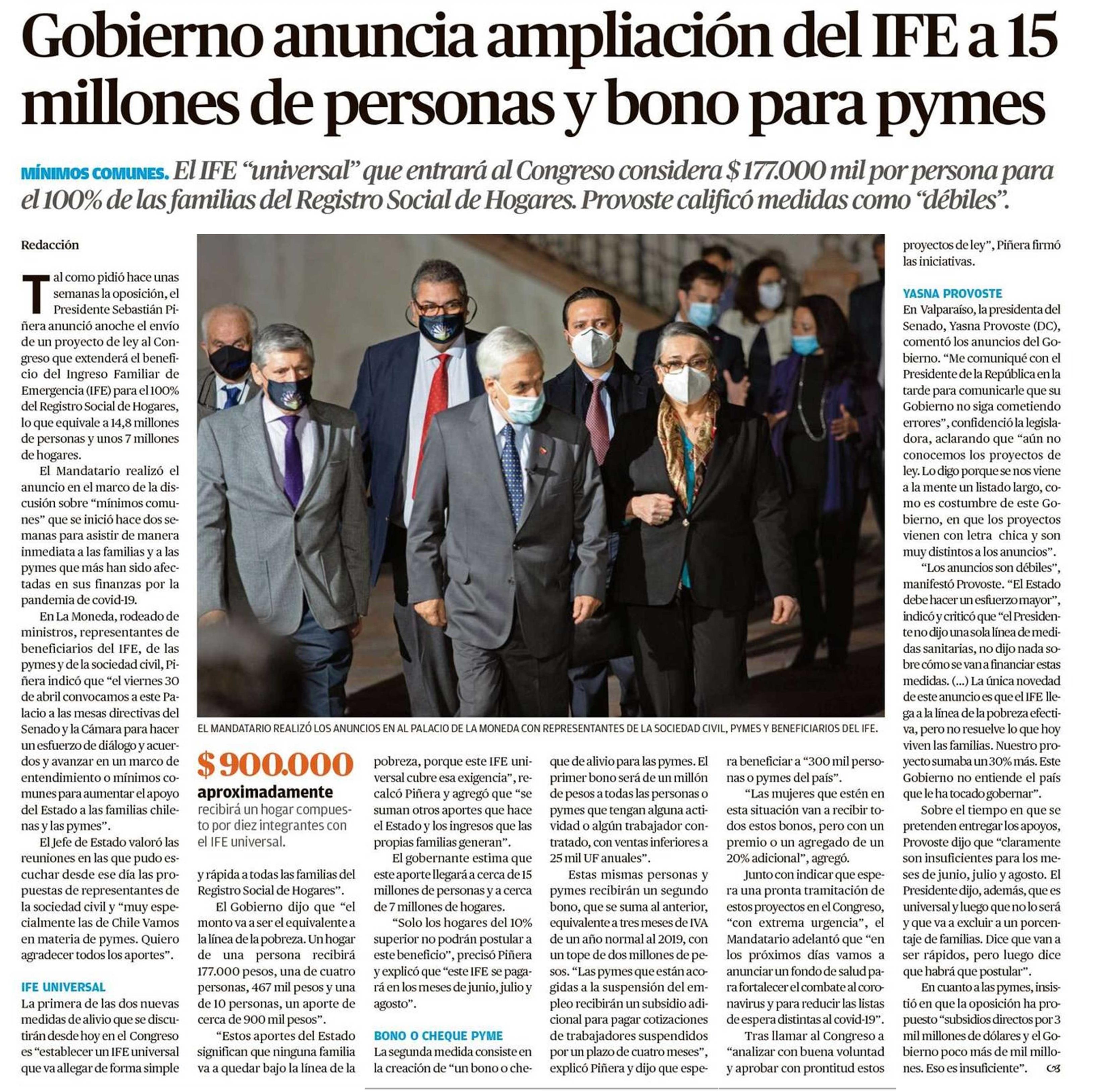 Estos beneficios se informaron en el marco de la negociación de la agenda de mínimos comunes entre el gobierno de chile, chile vamos y la oposición. Este miércoles el presidente de la república, sebastián piñera, anunció un ingreso familiar de emergencia (ife) universal, que beneficiará a más de 15 millones de personas, además de un bono para pymes de $1.000.000 y otras medidas. Mientras que para un hogar de cuatro personas, el monto del ife universal sería de $500.000 ($125.000 por persona). Respecto al resto de grupos familiares, no se entregó información adicional. El mandatario dio a conocer las propuestas finales tras los diálogos entre la oposición y.